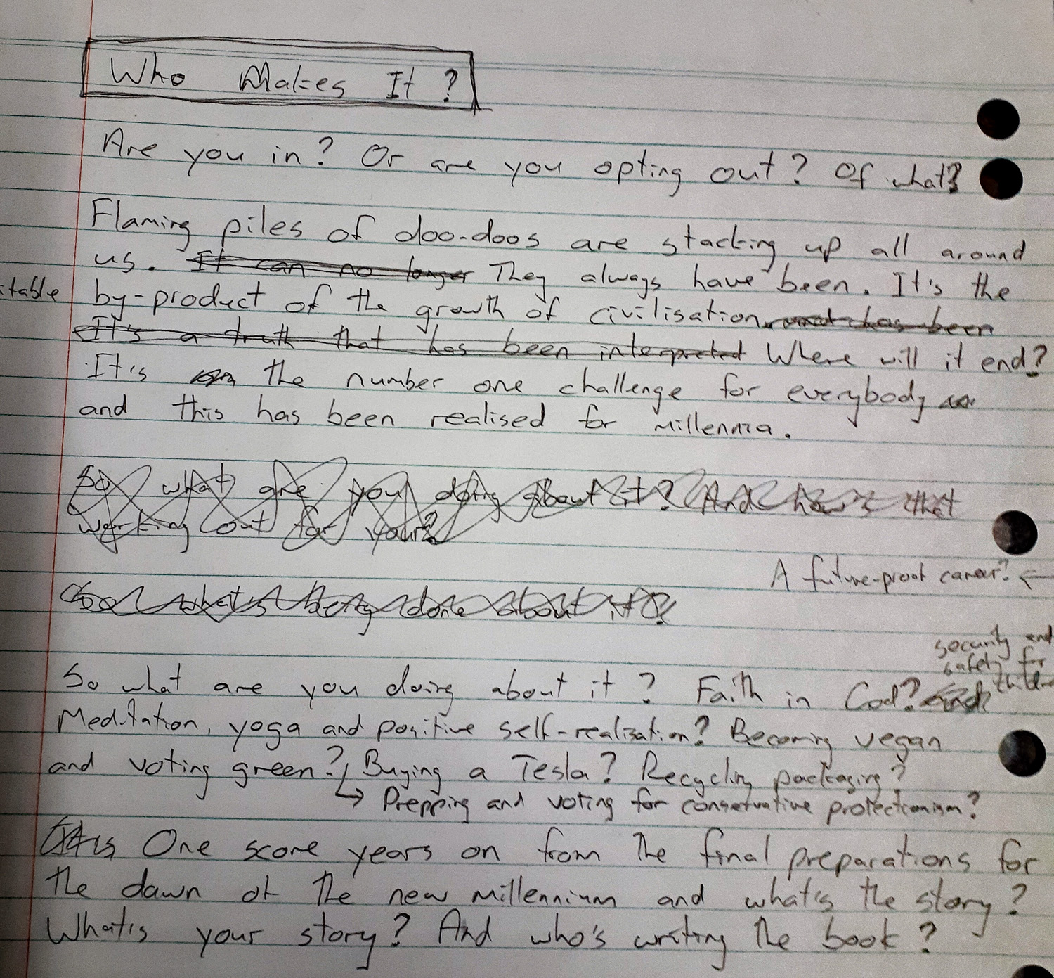 What was the discussion about millennialism/ millenarianism 20 years ago? Anything? The ‘New Age’ movement out of the nineties was quietly living the dream, while they self-realised the alternativeness of their spiritual knowingness, which wasn’t saying much, but it was probably a better conversation than what leaked out of any other religious crack-pottery. There might have been the odd “2000 years since what?” bumper sticker driving around. Jesus-freaks flogging their dead horse that was never going to carry their Lord back into reality.